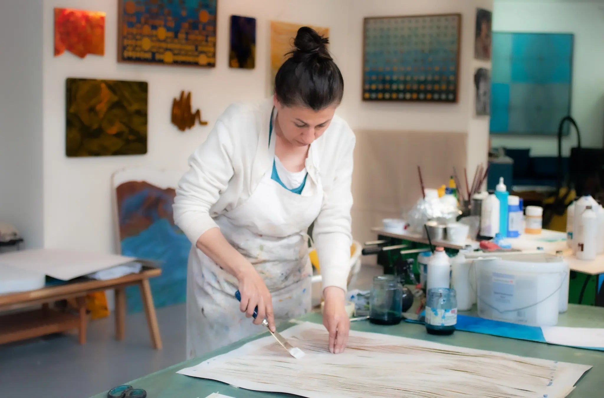 Anschließend absolvierte ich ein Textilstudium und praktizierte gleichzeitig weiterhin als Designerin. Gleichzeitig habe ich neben dem Abstrakten unzählige figurative Bilder gemalt und Wandteppiche geschaffen, die ich alle selbst gewebt und geknüpft habe.